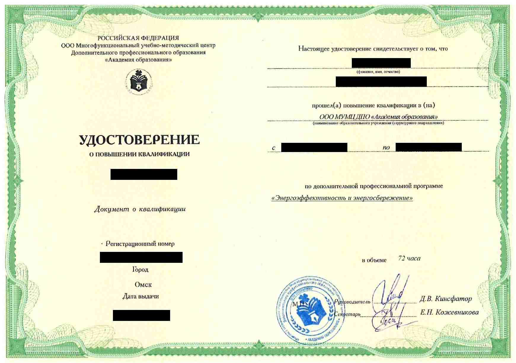 - Удостоверение о повышении квалификации установленного государством образца. Срок действия: 5 лет